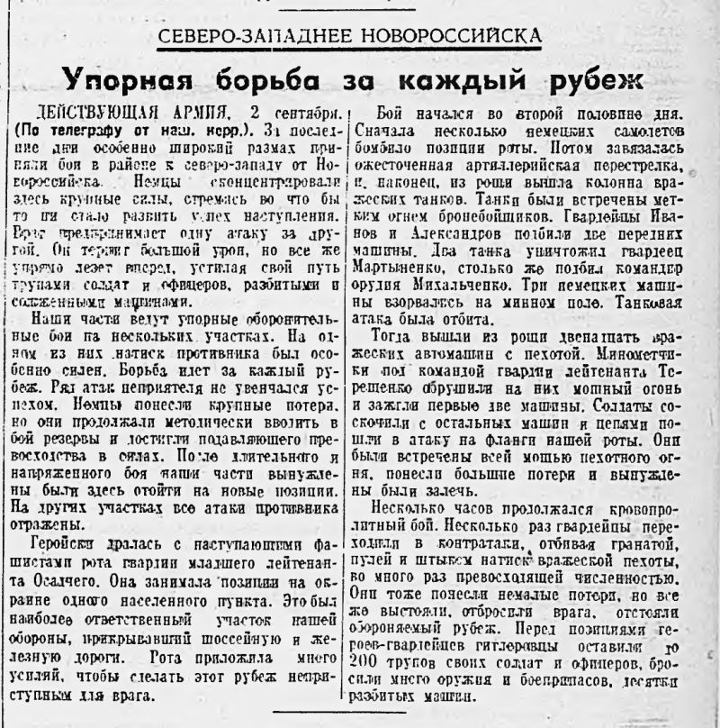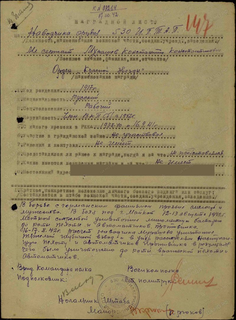 16-17.08.1942 расчет наводчика Мурашева уничтожил тяжелый гаубичный взвод, наступающую пехоту и автоматчиков противника. В результате чего было уничтожено до роты вражеской пехоты и автоматчиков".