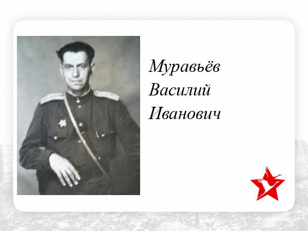 Мой дедушка - Муравьев Василий Иванович, 1907 года рождения. Место призыва: июль 1942 года, Пай-Арыкский РВК, Самаркандская обл., Пай-Арыкский р-н. Воевал в звании старшего лейтенанта 257 стрелковой Варшавского полка 185 Панкрато-Пражской ордена Суворова стрелковой дивизии 1-го Белорусского фронта. Имеет почетные грамоты от Верховного Главнокомандующего: № 223 от 17.01.1945 г. за освобождение столицы Польши - г. Варшавы; № 342 от 25.04. 1945 г. за завершение окружения города Берлин; №355 от 01.05.1945 г. за освобождение г. Бранденбург. Медали за освобождение Варшавы, Орден Красной Звезды (16/н от 31.01.1945г.), Орден Отечественной войны I степени (23/н от 23.03.1945 г.), Орден Отечественной войны II степени (81/н от 25.07.1945 г.)