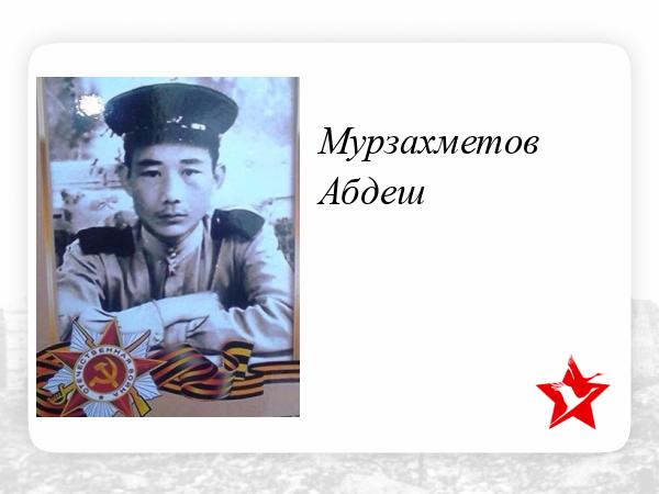 Мурзахметов Абдеш - наш отец.Ушел на фронт в 1942 году.Дошел до Берлина.В 1945 году августе охранял Берлинскую Конференцию Глав правительств Великобритании, США, СССР.За что получил личную благодарность от Народного Комиссара Внутренних Дел СССР товарища Берия.