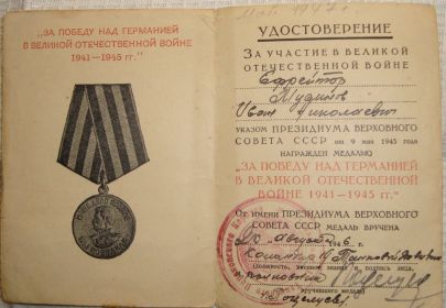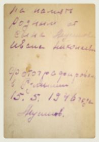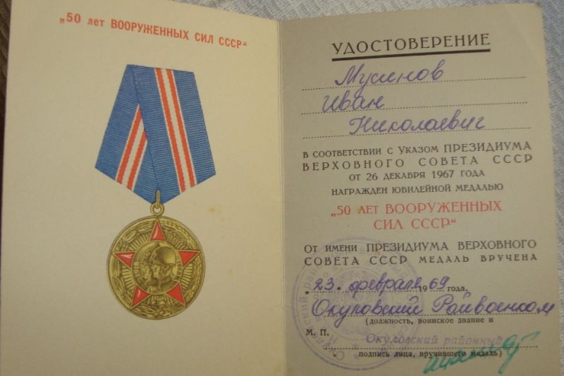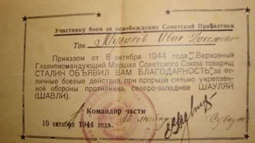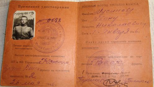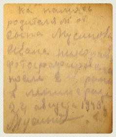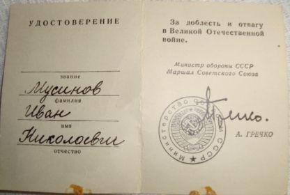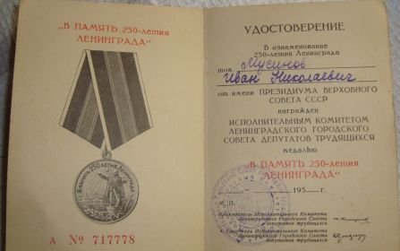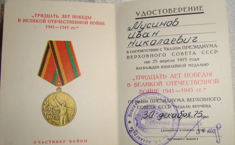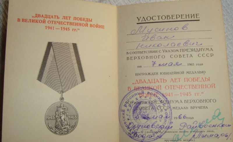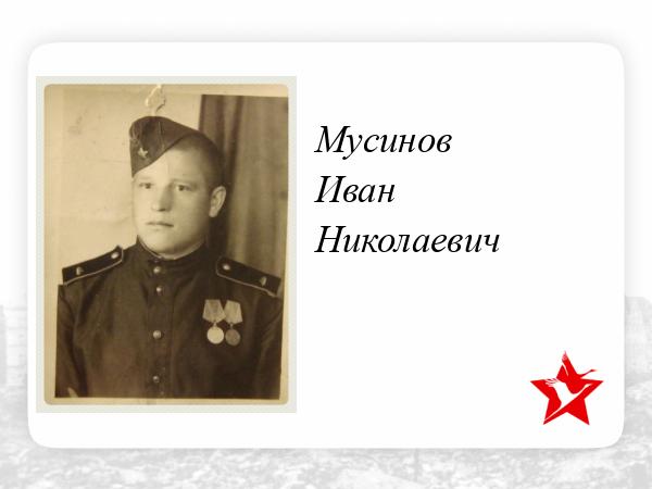 Мой дедушка Мусинов Иван Николаевич 1924 года рождения уроженец Ленинградской области Окуловского района с 8 по 20 марта 1942 года прослушал курсы сапер-минеров при Боровическом Райсовете и 23 мая 1942 в Окуловском Районном Военном Комиссариате Ленинградской области 110-ти часовую программу военобуча и был направлен на Ленинградски фронт. Указом Президиума Верховного Совета СССР от 22 декабря 1942 награжден медалью за оборону Ленинграда. Был ранен осколком в 1943 но вернулся в строй. 8 октября 1944 приказом Верховного Главнокомандующего Маршала Советского Союза товарища Сталина деду была обьявлена благодарность как участнику боев в освобождение Советской Прибалтики за отличные боевые действия при прорыве сильно укрепленной обороны противника северо-западнее Шауляй. Шавли. Освобождая Румынию 26 мая 1946 Управлением Южной Группы Войск фронта получил удостоверение военного мотоциклиста третьего класса. 20 августа 1946 награжден медалью за Победу над Германией в Великой Отечественной Войне 1941-1945 г в составе 19 танковой дивизии. 20 декабря 1946 награжден медалью за боевые заслуги. К сожалению мы не имеем информации как двигался полк в котором служил дед и рассказов деда не помним, были маленькие когда его не стало. Умер дед 14 июля 1980 года в возрасте 56 лет.