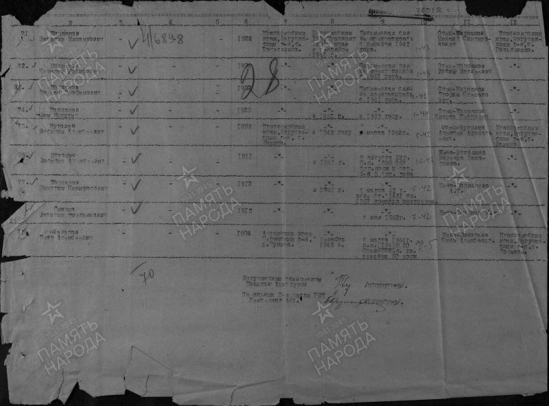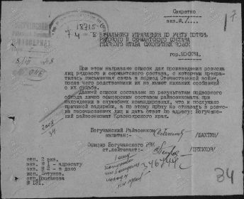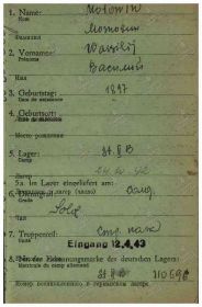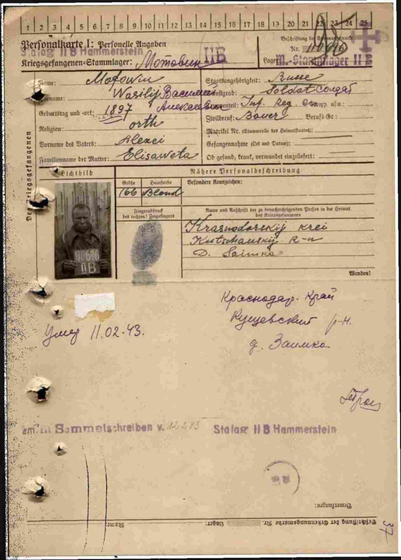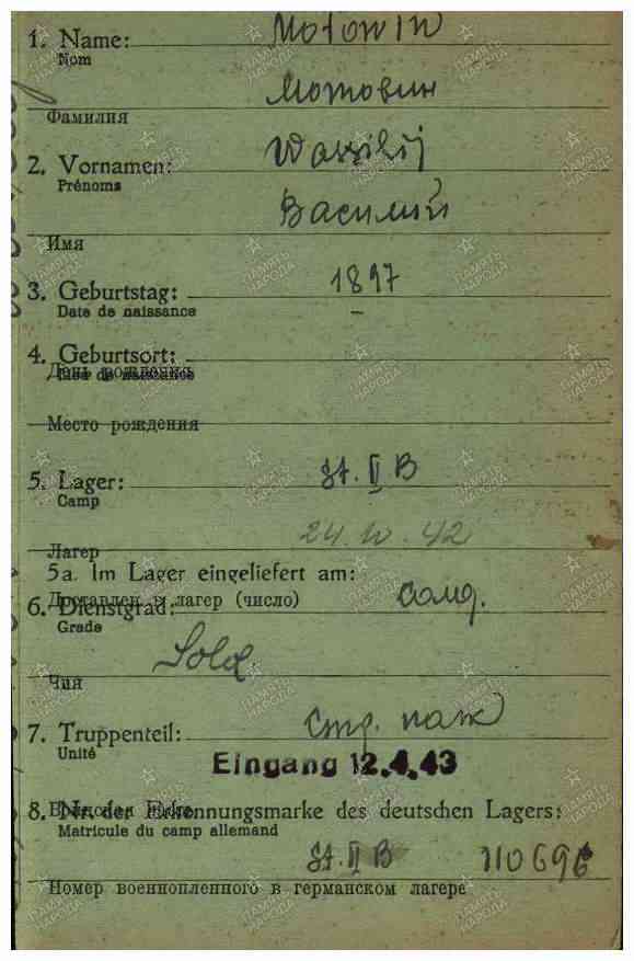 Мутовин Василий Алексеевич, 1897 (1899) г. р. Место рождения Красноярский край, Богучанский район, д. Заимка. Призван Богучанским РВК в июле 1942 года. Красноармеец. Стрелок. Отец, Мутовин Алексей Афанасьевич, подавал заявление на розыск сына в 1946 и 1948 годах. Последнее письмо родные получили в августе 1942 года.Признан пропавшим без вести в октябре 1942 года. Попал в плен 24.10.1942 года. Шталаг II B.Лагерный номер 110696. Погиб в плену 11.02.1943 года. Похоронен Польша, г. Хаммерштайн. В карточке военнопленного допущены ошибки: 1). Фамилия-Мотовин. 2). Адрес- Краснодарский край, Кущевский район, д. Заимка.