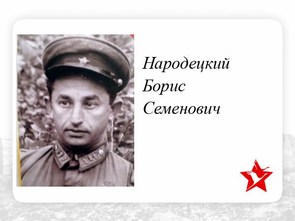 Мой дед Народецкий Борис Семенович, гвардии подполковник, заместитель начальника политотдела 47 гвардейской стрелковой Нижнеднепровской Краснознамённой ордена Богдана Хмельницкого дивизии. Добровольцем ушел на фронт с Высшей партийной школы при ЦК ВКП(б). На фронте с 23 июня 1941 года. Воевал на юго-западном направлении, защищал Москву, Сталинград, участввал в освобождении Ростовской области, Украины, Польши. Закончил войну в Берлине в 1945 году.