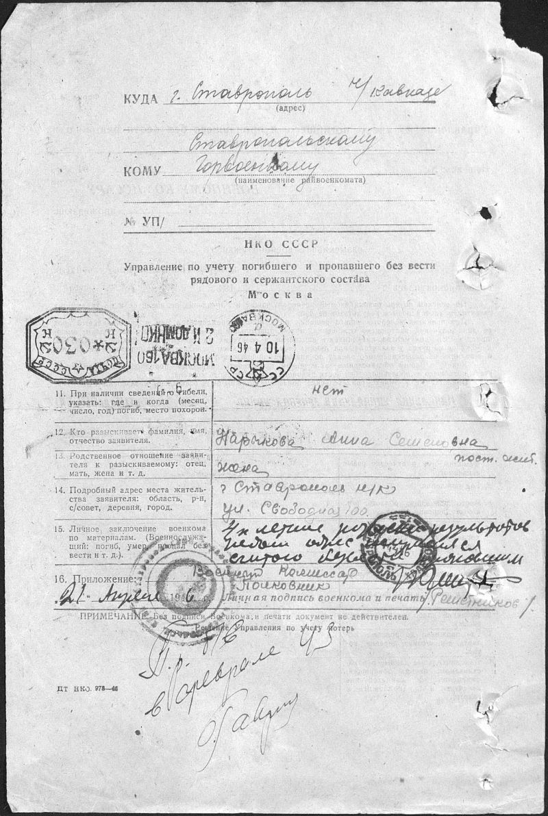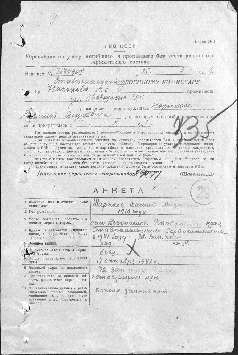 Василий Андреевич родился 25 февраля 1910 года в с. Безопасном, работал на заводе "Красный металлист" города Ставрополя формовщиком, был призван Ставропольским ГВК и ушел на войну в июне 1941 года. Пропал без вести в феврале 1943 года.