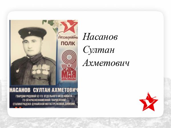 Мой дедушка Насанов Султан Ахметович, 1921 года рождения, был рожден в республике Казахстан, Уральской области, Альбеаинского района, с. Алеу, впоследствии, его родители были вынуждены бежать от голода, который разразился в Казахстане в 1920 – 1921 г.г. и отправились в Самарскую губернию, с. Кротовка, Александровского района, откуда дедушка и был призван в ряды РККА 15 марта 1942 года от Кротовского РВК Куйбышевской области.