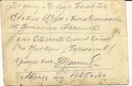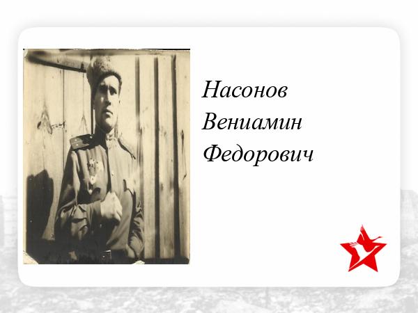Вениамин Федорович был родным братом моей бабушки Александры. Его портрет с боевыми наградами всегда висел на стене у нее в доме. Сам он жил в Красноярском крае в Ачинске. и я его никогда не видела, а только слышала рассказы о нем от бабушки. Уже после смерти бабушки я случайно нашла его фронтовое письмо с фотографией. После 90х гг. связи с его семьей : женой и детьми были прерваны. Знаю только, что у него было два сына.