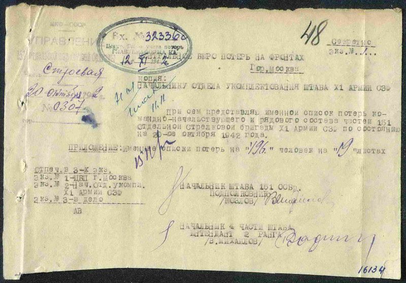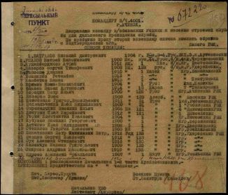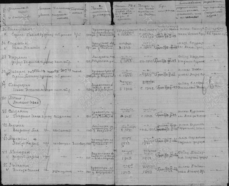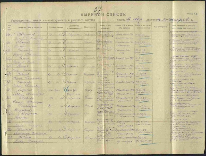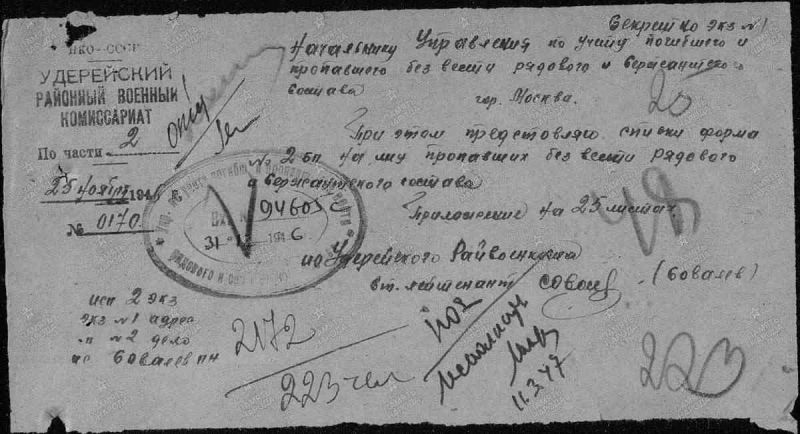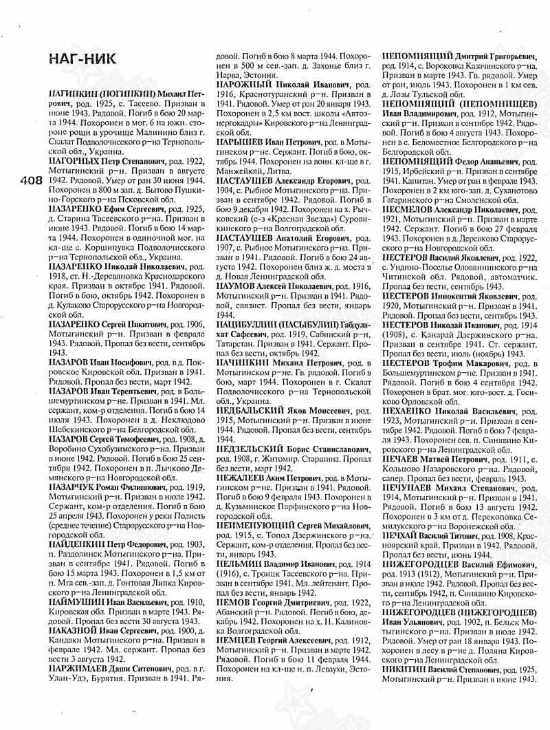 Назаров Сергей Тимофеевич, 1908 г. р. Место рождения Красноярский край, Сухобузимский район, д. Воробино. До войны жил в Красноярском крае, Удерейский район, прииск Новая Еруда. Призван Удерейским РВК в 1942 году. Красноармеец. Стрелок. В/ч 151 сбр. Жена, Назарова Мария Сергеевна, в заявлении на розыск мужа писала, что последнее письмо получила в декабре 1943 года. Признан пропавшим без вести в марте 1944 года. Назаров С. Т. пропал без вести 25.09.1942 года в Ленинградской области, в районе ст. Лычково.