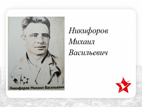 Никифоров Михаил Васильевич родился 7 сентября 1907 года в городе Пугачёве,Саратовской области. В школе он учился хорошо, участвовал в строительстве Горьковского автозавода,воевалсвоевал белофиннами, работал шофером. Великая отечественная война застала прадеда в командировке, когда он вернулся то взял повестку пришедшую ещё в первый день войны и отправился на фронт.Мой прадед воевал на северо-западном фронте на передовой, в танковой бригаде шофёром на бензовозе. Танки в бой он за ними,з там к горючим во время боя. По рассказу моей бабушки, его дочери с ним произошл из ряда вон выходящий случай. Однажды в минуты короткого затишья он сослуживцами-шоферами сидел в воронке,и вдруг краю подкатилась мина. Всё тут же повыскакивали, а прадед мгновенно поседел. За время Великой отечественной войны был ранен и контужен. После госпиталя снова на фронтя. Победу Михаил Васильевич встретил в Кенигсберге,был направлен на дальний восток но к счастью ему не пришлось еще раз пережить войну,их эшелон развернули на полпути назад. За время Великой отечественной войны мой прадед был награжден орденом Красной звезды и многочисленными медалями.После войны работал на Броском авторемонтном заводе. Обучилс профессии многих ребят.Умер мой прадед 24 июля 1967 года в возрасте 59 лет.Наша семья гордится Михаилом Васильевичем и чтит его память.