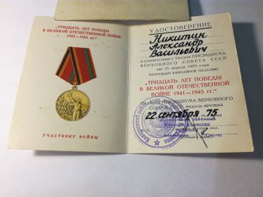 25 апреля 1975 года был награжден медалью "ТРИДЦАТЬ ЛЕТ ПОБЕДЫ В ВЕЛИКОЙ ОТЕЧЕСТВЕННОЙ ВОЙНЕ 1941-1945 гг.". От имени ПРЕЗИДИУМА ВЕРХОВНОГО СОВЕТА СССР медаль вручена 22 сентября 1975 года. Удостовирение было выдано "Калининеный районный Военный Комиссар Таллин полковник (Сирга)".