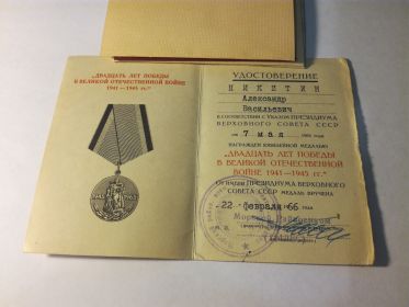 7 мая 1965 года был награжден медалью "ДВАДЦАТЬ ЛЕТ ПОБЕДЫ В ВЕЛИКОЙ ОТЕЧЕСТВЕННОЙ ВОЙНЕ 1941-1945 гг.". От имени ПРЕЗИДИУМА ВЕРХОВНОГО СОВЕТА СССР медаль вручена 22 феврался 1966 года. Удостовирение было выдано "Морской Райвоенком(ТЫЛЕС)".