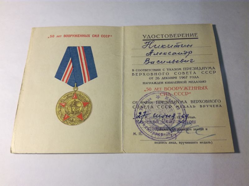 26 декабря 1967 года был награжден юбилейной медалью "50 ЛЕТ ВООРУЖЕННЫХ СИЛ СССР". От имени ПРЕЗИДИУМА ВЕРХОВНОГО СОВЕТА СССР медаль вручена 27 июня 1969 года. Удостовирение было выдано "Морской Райвоенком(ТЫЛЕС)".