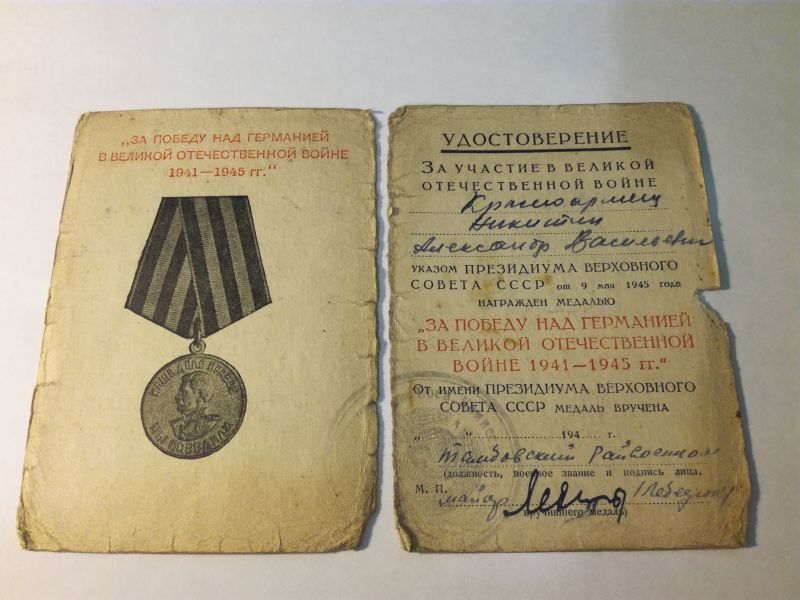 9 мая 1945 года был награжден медалью "ЗА ПОБЕДУ НАД ГЕРМАНИЕЙ В ВЕЛИКОЙ ОТЕЧЕСТВЕННОЙ ВОЙНЕ 1941-1945 гг.". От имени ПРЕЗИДИУМА ВЕРХОВНОГО СОВЕТА СССР медаль вручена "Неизвестно". Удостовирение было выдано "Тайбовский Районном отделе Майором(Лебедев)"
