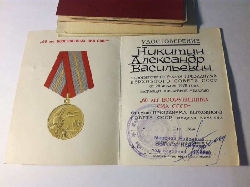 28 января 1978 года был награжден медалью "60 ЛЕТ ВООРУЖЕННЫХ СИЛ СССР". От имени ПРЕЗИДИУМА ВЕРХОВНОГО СОВЕТА СССР медаль вручена "Неизвестно". Удостовирение было выдано "Морской Районный Военный Комиссар подполковник(Хейм)".