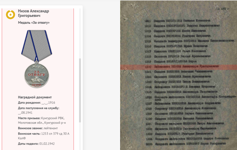 Низов Александр Григорьевич родился в 1916г., отслужил срочную службу в рядах РККА в 1937-1939 гг. С началом войны ушел добровольцем на фронт. По документам был Призван в августе 1941г. Кунгурским РВК, Пермской (Молотовской) области. Служил в 1253 стрелковом полку, 379 стрелковой дивизии. Участвовал в боях под Москвой, в Калининской, Ржевско-Вяземской операции. В феврале 1942 г. в бою за г. Погорелое-Городище на Калининском фронте помошник начальника штаба по разведке лейтенант Низов А.Г. был тяжело ранен осколком в правую кисть и пулевое в правое предплечье с повреждением кости. Лечился в эвакогоспитале №1318 в г. Владимире до апреля 1942 г., далее вернулся в свою часть на фронт. В 1943 г. повторно ранен в боях на Волховсеом фронте, после лечения признан не годным к строевой службе, с 1944г служил в Курганского райвоенкомате Курганской области ( в 1945 г - старший инструктор 4 части Курганского РВК). После службы вернулся на родину в г.Кунгур, работал начальником отдела кадров ж.д.станции Кунгур, умер в 1966г, похоронен на кладбище села Филиповка Кунгурского района.