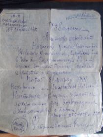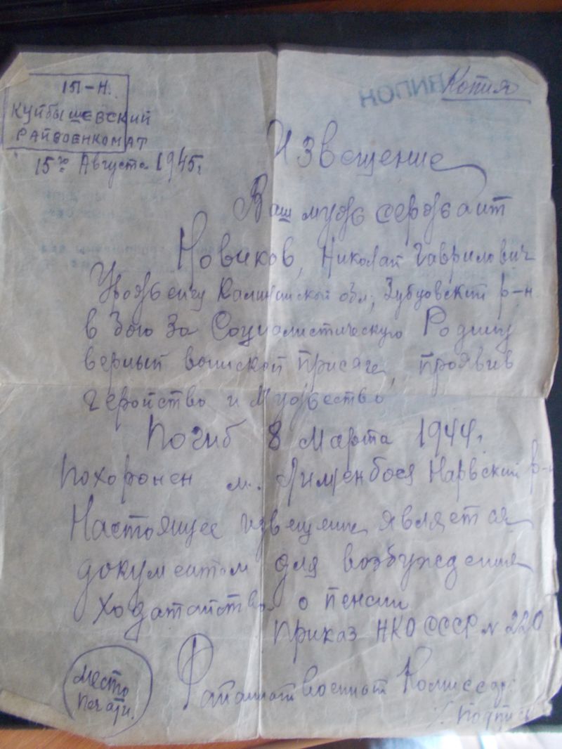 Новиков Николай Гавоилович был призван в Красную армию 8 сентября 1941г. в Ленинграде. Героически погиб в боях за Родину 8 марта 1944г. и похоронен на станции Лим-енбося Нарвского р-на. Мой папа ушел на войну когда мне было полтора года. Личных воспоминаний об отце у меня нет, а сохранилось всего две фотографии и три документа которые я и посылаю. Благодоря моей маме -труженице тыла Фроловой Ефросиньи Фроловне мы выжили в блокаде. Спасибо и низкий поклон всем воинам бессмертного полка, что они заслонили своей грудью нас и мы остались в живых