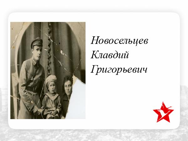 капитан Новосельцев Клавдий Григорьевич, 1902 года рождения (прадедушка моего мужа Евгения Николаевича 1979 г.р). Был помощник начальника отделения штаба 85стрелковой дивизии, пропал без вести в 1941 году на Западном фронте . Муж нашел место, где имя его прадеда навечно вбито на одной из пятнадцати стел с именами воинов, погибших в ходе сражений в Великой Отечественной войне. Мемориал этот находится в Лагерном саду в городе Томске. Призывался он из Новосибирской области. , потом области разделились после войны.Там где стоит стелла теперь город Томск Томской области.