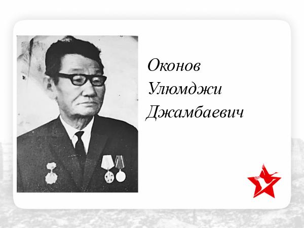 Оконов Улюмджи -участник Великой Отечественной войны, член КПСС с 1939г., воевал в составе Кубанского краснознаменного Кавказского корпуса 30 Краснознаменной кавалерийской дивизии, был ранен. в 1944 году был отозван с фронта и направлен на строительство Широковской ГЭС в Молотовскую область. Жил в п.Кумской. С 1961 года работал рабочим в Кумской МЖС. Был женат, имел дочь. Умер в октябре 1979 года в п.Кумской.