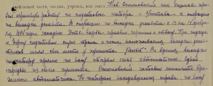 Десант, особенно зимний, операция не из простых. На "ура" её не проведёшь - это понимал каждый из нас. Понимали и то, что подготовка к нему будет серьёзной. Но никто и не догадывался, что она будет столь сложной... . А началась операция с того, что десантников, бойцов 260-й бригады морской пехоты, размещали по кораблям и каждому из них сразу же назначали место: кубрик, койку и рундук, место для оружия - автомата, станкового или ручного пулемёта, ПТР, миномёта. Море есть море, всё должно иметь своё место, всё - закреплено по-походному. Мы, катерники, старались показать десантникам, что и как делать; более всех в этом преуспевал наш боцман - старшина 1-статьи Николай Осмоловский, молодой коренастый круглолицый парень.
