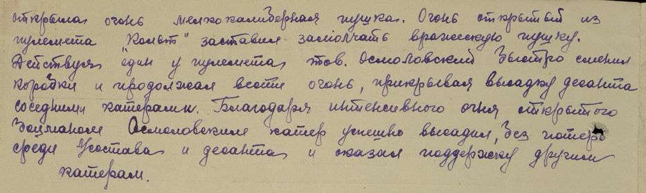 При подходе к берегу и при высадке в первый момент нас осветил прожектор. Стрельбы вначале не было. Лишь когда мои бойцы показались на берегу, заработал крупнокалиберный пулемет, но огонь был слабый, редкий. Артиллерия и минометы молчали. Наши катера тоже вели огонь по противнику. Я со своим взводом приступил к выполнению боевого задания. На берегу встретил группу бойцов первой и второй рот без командиров. Всех принял под свою команду. В бой повел человек семьдесят.