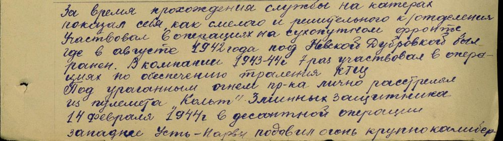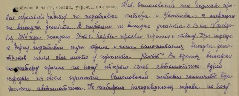 И вот в ночь на 14 февраля мы двинулись под Нарву. На катере МО находились командир С. П. Маслов, начальник штаба А. Молков, писарь старшина 1 статьи Тарасенко, я и приданные командиру радисты (фамилий их не знаю). Когда мы подошли к месту высадки, то левый фланг сильно обстреливался фашистами. Там высаживалась рота под командованием лейтенанта Зосимова.