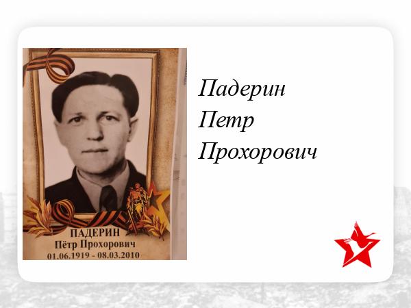 Был призвать в 18 лет, участник ВОВ, дошёл до Белина, получил ранение, лежал в госпитале, вернулся с победой. Награжден медалями и орденами. У Петра Прохоровича родилась дочь, есть две внучки и пять правнуков.