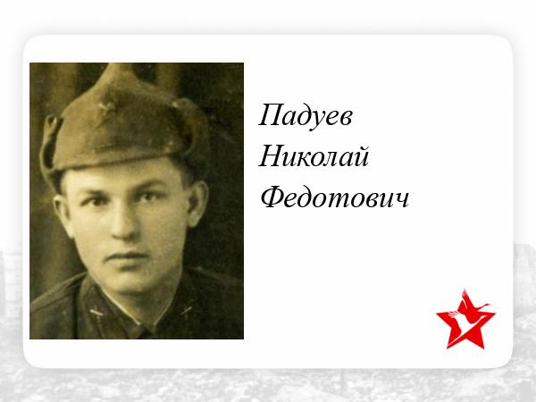 Падуев Николай Федотович родился в 1918 году. Место рождения Чувашская АССР, Яльчикский р-н, село Большие Яльчики. Окончил Батыревское педагогическое училище. Работал учителем начальных классов селе Большие Яльчики.