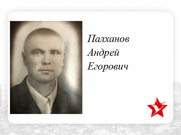 Палханов Андрей Егорович был призван в армию с первых дней войны. Служил санитаром в 498 походно полевом госпитале и выносил раненых солдат с поля боя. Оказание медицинской помощи производилось в любое время суток и независимо от силы огня противника. В бою под городом Казельск был тяжело ранен. Умер 18.01.1942 от ран в госпитале города Казельска, захоронен в братской могиле.