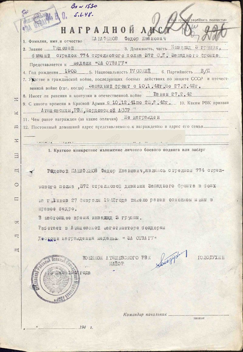 Получил ранение осколком мины в правое бедро 27.02.1942 под городом Юхнов. Комисован по ранению.