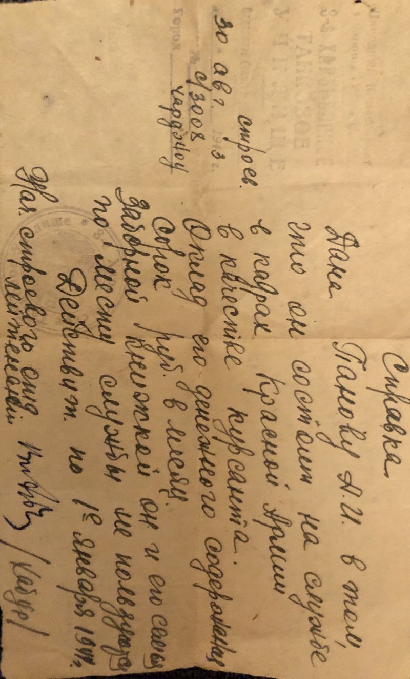 О моем деде, Панове Александре Ивановиче, мне известно довольно мало. Его жена, моя бабушка, Панова Надежда Егоровна, о нем мне не рассказывала, поскольку до конца жизни боль утраты сохранялась в ее сердце. От моего отца, единственного сына Панова Александра Ивановича и Пановой Надежды Егоровны, я знаю, что дед был одаренным человеком: хорошо рисовал, играл на различных струнных инструментах, хорошо пел. Главное- он сильно любил свою супругу и сына, стремился все свое свободное время проводить вместе с ними. Из документов, бережно сохраненных моей бабушкой, мне стало известно, что весной 1942 года мой дед был призван на военную службу в Рабоче-Крестьянскую Красную Армию рядовым. Осенью 1943 года, согласно справки, он уже проходил службу курсантом 3 -его Харьковского танкового училища в г.Чарджоу. Из скупых рассказов бабушки мне известно, что это были ускоренные курсы подготовки командиров танков, которые он закончил в конце 1944 года, получил назначение и в составе эшелона был направлен на фронт. Во время движения эшелона по территории Польши, эшелон был атакован прорывавшейся из окружения немецкой воинской частью. Танк моего деда вступил в бой, сразу после спуска с железнодорожной платформы. Что было дальше - не известно. Только из скупых строк извещения о смерти деда следует, что в 2 часа ночи 25 января 1945 года мой дед, верный воинской присяге и проявив геройство и мужество, был убит и похоронен в г.Шленец /Польша/. Бабушка в течение своей жизни несколько раз пыталась поехать на могилу деда, но так и не сложилось...