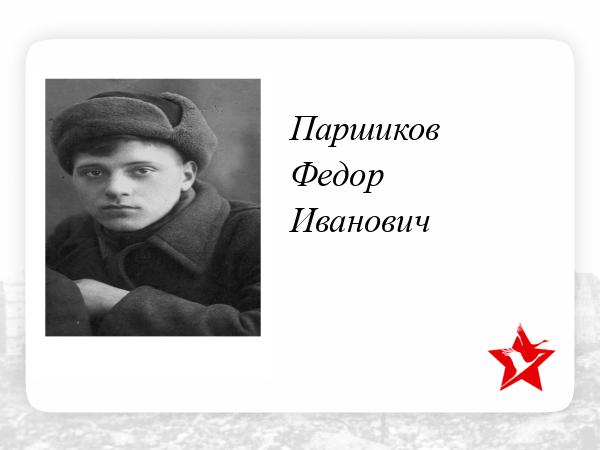 Мой дядя по линии мамы Паршиков Федор Иванович, родился в 1920г. в д.Гагаринские Дворики, Хоботовского района, Тамбовской области где и проживал с родителями: отцом Иваном Кузьмичем (1890г.), матерью Марией Потаповной (1894г). Кроме него в семье было еще четверо детей: Анна (1914г.), Клавдия (1925г. моя мама), Виктор (1927г.) и Сегрей (1929г.). Осенью 1940г. Хоботовским райвоенкоматом Остролучинского сельсовета он был призван в армию. Службу проходил в Карело-Финской ССР, п.Куйвози. Уже в ходе начавшейся войны окончил курсы младших командиров и был направлен на фронт, об этом он написал в своем последнем письме родителям, но куда именно его направляли не сообщил, а может быть на тот момент и сам не знал. Между тем, недалеко от его местанахождения, под Волховом и Ленинградом в то время шли ожесточенные бои (Волховский и Ленингадский фронты). Предположительно в те районы боевых действий он и мог быть направлен. Длительное время от него не было писем, а в конце 1942г. родителям пришло сообщение, что их сын Федор пропал без вести. До настоящего времени о его судьбе ничего не известно. Предпринятые мною попытки найти какие либо сведения о моем дяде в архивах Министерства Обороны РФ и др. ведомствах, а также архивах Германии, не увенчались успехом.