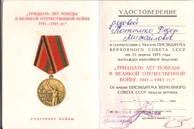В апреле 1945 года во время боевых операций против немцев Фёдор Потимко получил тяжелое ранение в голову, которое чудом не оказалось смертельным. Однако на долгое время он считался погибшим и даже был внесён 2 сентября 1945 года в официальный список погибших советских партизан провинции Империя.