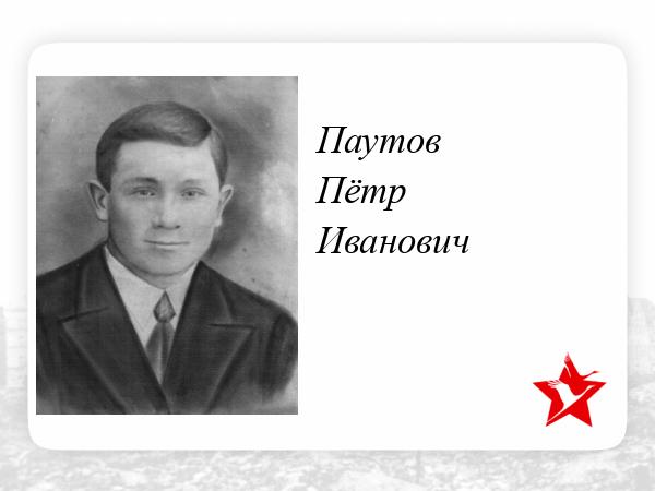 Сведения о боевом пути Паутова Петра Ивановича собирала из разных источников. В Книге памяти РФ Костромской области, том 1 записано: "Паутов Пётр Иванович, русский, член партии, младший политрук. Призван 13.08.1941 года Костромским ГВК. Погиб 17.07. 1942 года. Захоронен: дер. Загоски, Старорусский район Ленинградской области (из именного списка безвозвратных потерь 26 сд на 01.08.1942 г., Приложение № 18650 с). На сайте "Память народа" удалось найти следующие сведения: место службы - 26-я стрелковая дивизия, 87 стрелковый полк, штаб. Полное название подразделений - 26-я стрелковая Сталинская дважды Краснознамённая ордена Суворова дивизия, 87-й Карельский Краснознамённый стрелковый полк. На 22.06.1941 года 26 сд дислоцировалась в г. Дальнереченске (Приморский край). С 01.09.1941 г. одной из первых дивизий с Дальнего Востока начала переброску и прибыла в Ярославлью 18.09.1941 г. дивизия выступила маршем на Валдай и уже 24.09 с марша вместе с другими дивизиями 11-й армии СЗФ атакует противника (дивизию "Мёртвая голова") в районе Лужно, Красея. Результат боёв - остановка наступления фашистских захватчиков на Октябрьскую жд восточнее оз. Ильмень. В этих упорнейших боях 26 сд потеряла около трети своего состава. 07 - 09.01.1942 г. из дивизии в резерв армии изъят 87 сп, в котором служил дедушка. Полк был возвращён на фронт летом 1942 г. В это время идут бои за Рамушевский коридор в районе Борисово - Гридино. 17.07.1942 г. при поддержке 87 сп 26-я дивизия переходит в наступление. Преодолевая лесные заграждения, глубокие минные поля, под сильным арт., миномётным и ружейным огнём вплотную подходит к переднему краю противника. В этом бою мой дед погиб. Похоронен не в братской могиле, отдельно в дер. Загоски, Старорусский район Ленинградской области. В настоящее время это территория Новгородской области, которая была образована 05.07.1944 г. Сама деревня, видимо, не сохранилась, но есть воинские захоронения в Парфинском районе (левый берег реки Ловать, на юг от Парфино по дороге на д. Редцы).