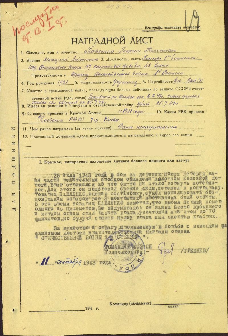 Павленко Георгий Николаевич был комсоргом 3-го батальона 409 Стрелкового полка 137 Стрелковой дивизии 48 Армии. 25 июля 1943 г. в бою за деревню Новая Деревня, Орловской области, Свердловского о р-на, части решительным броском овладели полотном железной дороги. Враг стремился вернуть потерянные участки. Для этого были подброшены свежие силы, враг перешел в контратаку. Товариц Павленко Георгий Николаевич, оценив обстановку, сумел мобилизовать бойцов, таким образом все 3 контратаки противника были отбиты. В это время Георгий заметил, что выбыл первый номер одного из пулеметов,и он занял место выбывшего. Метким огнем стал разить врага, уничтожив при этом до 70 фашистов. Будучи сражен пулей врага пал смертью храбрых.