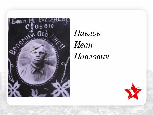 Мой дед Павлов Иван Павлович 1911 г. Проживал д. Загородье Ручковского с\с Калининской обл Прошёл две войны Финскую и ВОВ. . Воевал на Невском пятачке, пехота " царица полей" Был тяжело ранен, лечение проходил в госпиталях . Омска и . Томска. В госпитале ампутировали ногу.. Был награждён. ( к сожалению награды были украдены, в данный момент обратились в военкомат с просьбой об установлении наград) Умер в августе 1956 г.