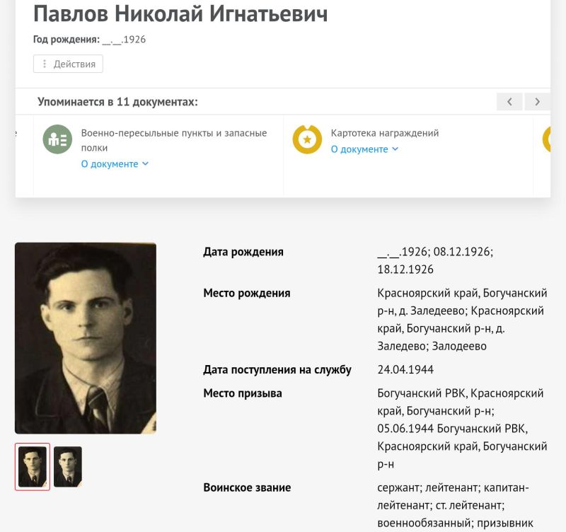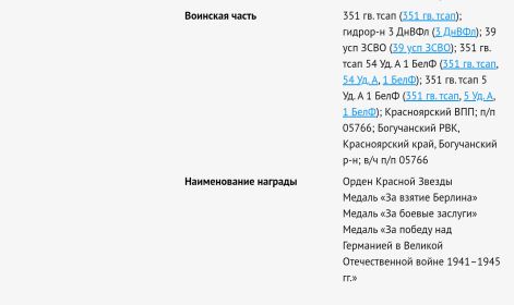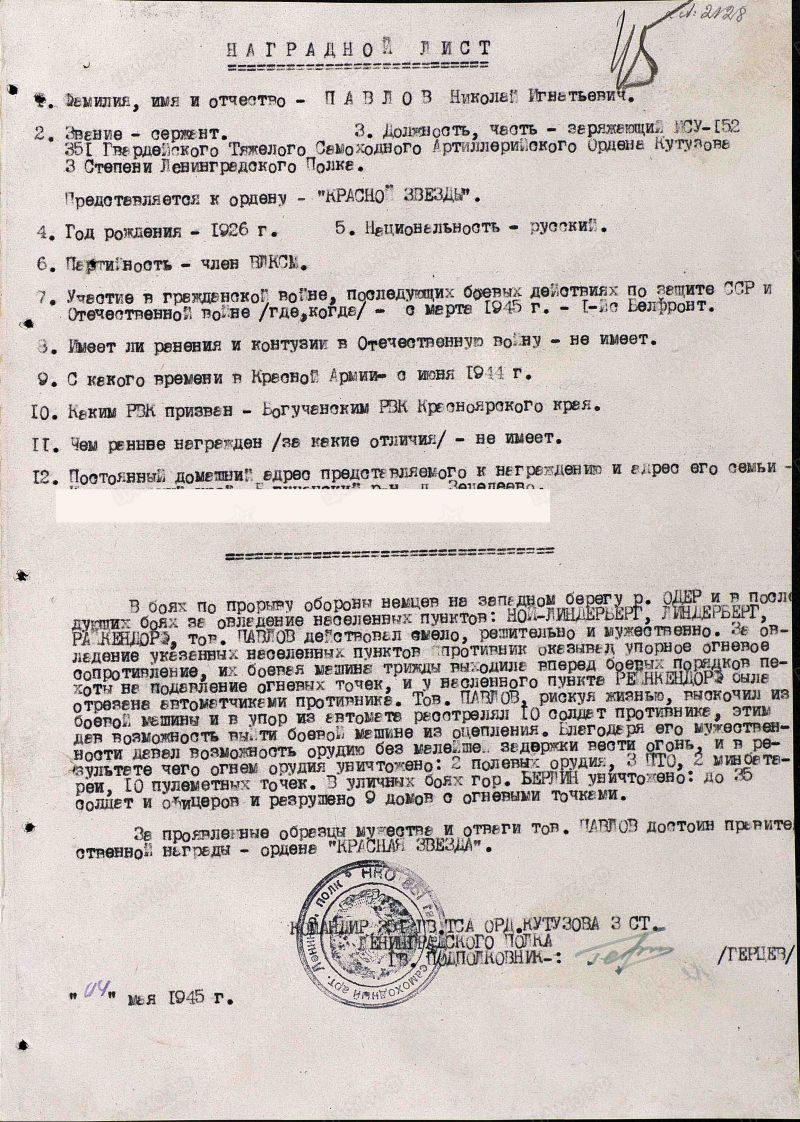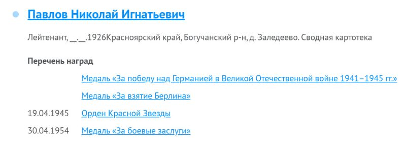 Павлов Николай Игнатьевич, 1926г.р Место рождения Красноярский край, Кежемский район, д.Заледеево. Призван Богучанским РВК в 1944году. Ст.лейтенант. Заряжающий ИСУ 152.В/ч 351 гв.тсап.Участник штурма Берлина. Награжден орденом Красной Звезды, медалью За боевые заслуги, медалью За Победу над Германией в Великой Отечественной войне 1941-45гг, медалью За взятие Берлина.