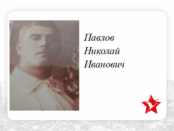 Мой дедушка Павлов Николай Иванович 1896 г .рождения ушел на фронт в 45 лет, когда моему отцу было всего три года. Жена его работала учительницей в местной школе. Всего у них было 12 детей. Мой отец не помнит своего отца, так как когда он ушел на фронт, он был совсем маленьким и к сожалению не вернулся домой. По имеющимся данным архива дедушка поступил в госпиталь в Смоленской области 28 декабря 1943 года, а 2 января 1944 г. скончался в госпитале. Последнее место службы 43А 1119 сп.Похоронен был в Смоленской обл., Роднянский р-н, д. Малое Микулино, кладбище.