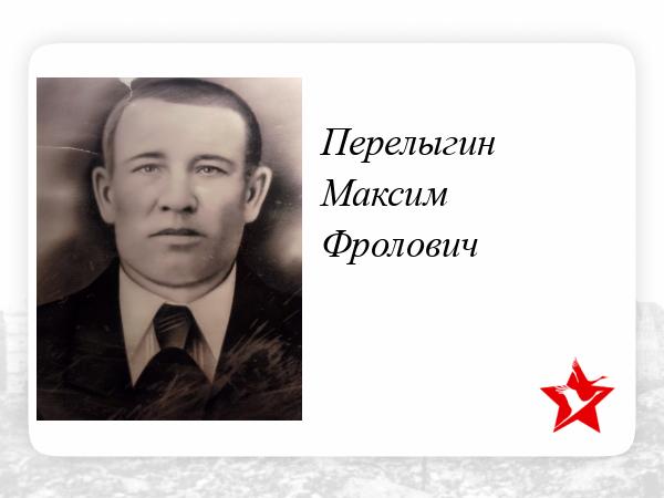 Перелыгин Максим Фролович, 1905 года рождения. На войну был призван 09.10.1941году в Боково-Антрацитовскую РВК, Украинской ССР, Ворошиловоградская область, Боково-Антрацитовский район. Воинское звание Красноармеец, 846 Артиллерийский полк, 32 А. В боях под Крымом был ранен в руку. Вернулся с войны в 1944, (комиссован как инвалид войны).После войны награжден медалью "За боевые заслуги" .