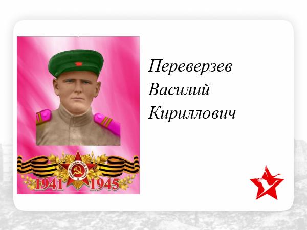 За участие в Великой Отечественной войне Переверзев Василий Кириллович удостоен высоких наград: Слава III степени и две медали За отвагу .