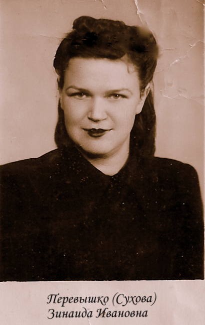 Зинаиде Перевышко (в девичестве Сухова) было 18 лет, когда она уходила на фронт добровольцем. Это моя мама.В самом начале войны в дом пришло известие, что Сухов Алексей (это мамин родной брат) пропал без вести. Родители остались без сына. В семье это известие приняли как похоронку, т.к. Алёша был курсантом военного училища, которое располагалось на западной границе. И наши мальчики оказались сразу на передовой, да ещё в самые первые дни войны! Бедные родители, мои бабушка и дедушка - им было о чём горевать! На войне Мама встретила свою первую любовь - это Перевышко Иван Иванович. И в 44-м они поженились, их расписали прямо в части. Закончила мама службу в феврале 1945 года. В нашем городе, как и всюду по стране, ветераны всегда в эти дни почётные гости в школах . на встречах с молодёжью. Мама встречалась всегда с удовольствием, рассказывала она недолго и интересно. Но, к сожалению, не нам, дочерям. Сейчас так о многом бы хотелось спросить... Но в 2000-м году мамы не стало. Помним. Любим. Гордимся!