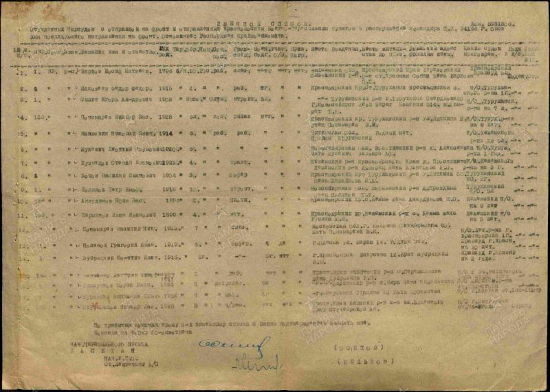 Перминов Иван Иванович, 1899г.р Место рождения Омская область ,Сидельниковский район. До войны жил в Красноярском крае, Кежемский район, с.Кежма. Призван Кежемским РВК в 1944 году.Красноармеец. Стрелок. В/ч 1018 сп 269 сд.Убит в бою 17.01.1945 года.Похоронен Польша. Варшавское воев.,пов. Пшаснышский,д.Шиглы. Перезахоронен Польша. Мазовецкое воев.,г.Макув Мазовецки.Жена Русина Антонина Васильевна.