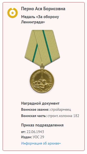 Бабушка была награждена военными наградами: орденом Отечественной войны, медалями «За оборону Ленинграда», «За Победу над Германией».
