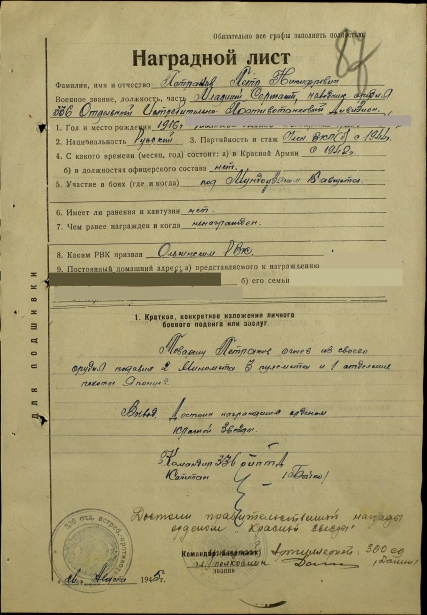 Во время войны дедушка продолжал служить на Дальнем Востоке. С сентября 1939 года по март 1942 года он был стрелком-охранником стройки No27 Ольгинского района Приморского края. С марта по октябрь 1942 года был курсантом учебного батальона, потом помощником командира взвода 18 отдельного истребительного противотанкового дивизиона. В 1945 году с августа по сентябрь, участвовал в войне с Японией. Во время боевых действий был ранен, долгое время пролежал в госпитале, но, к сожалению, документов, подтверждающих ранение, не сохранилось. Все они сгорели во время пожара в авиакатастрофе. Только рубец на теле напоминал о тех тяжких временах. «Воевать было тяжело, - вспоминал дедушка, - сердце ныло, просилось домой. Ведь дома осталась молодая жена. Но долг перед Родиной был превыше всего». Женился дедушка еще перед войной в 1936 году, на очень доброй и красивой девушке Прониной Василисе (моей бабушке). Бабушка ждала дедушку всю войну, верила и надеялась – он вернется. И он вернулся! Дедушка возвратился домой в 1946 году в звании младшего сержанта, и как поется в песни – вся грудь в орденах и медалях. Он награжден орденами Красной Звезды, Отечественной войны 2 степени, медалью «За победу над Японией», медалью Жукова и пятью юбилейными медалями.