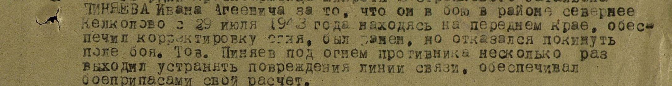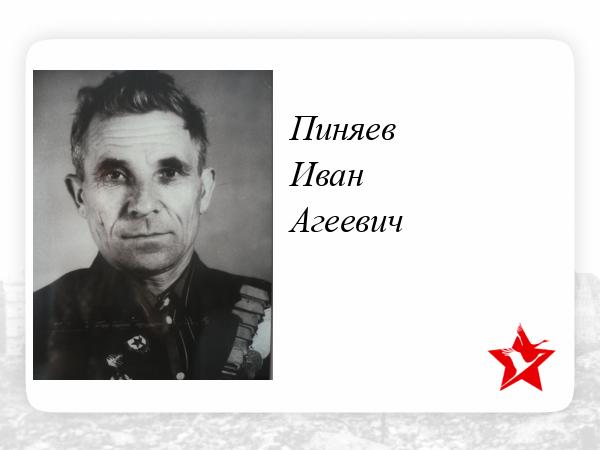 ПИНЯЕВ Иван Агеевич родился 5 сентября 1923 г. В 1941 г. восемнадцатилетним деревенским парнем ушел на фронт. Служил сержантом сухопутных войск сержантом разведывательной роты. На Ленинградском фронте в 1942 г. был ранен. Затем было лечение в госпитале г. Выборга и снова передовая. Иван Агеевич сражался за освобождение Ленинграда и был награжден медалью «За освобождение Ленинграда». Этой медалью дедушка очень дорожил – одной единственной из многих.