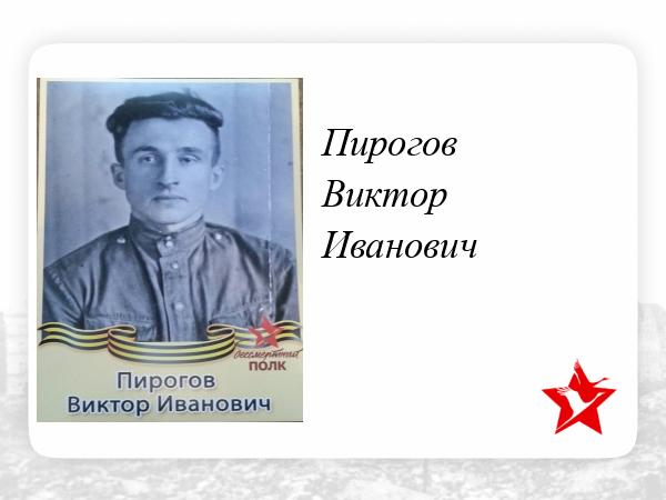 Пирогов Виктор Иванович родился в Марийской АССР, в Косолаповском районе, деревне Бор 28 февраля 1927 года. Русский. Проходил воинскую службу со 2 декабря 1944 года по 19 декабря 1951 года. Присвоено военское звание младший сержант. В годы войны был стрелком. С 1945 года по 1951 год был шафёром, бригадиром по авторемонту. Награждён знаками отличия " Отличник Советской армии" и " Отличный шафёр". В послевоенное время проживал в городе Воронеже, работал на авторемонтном заводе. Умер 16 октября 1993 года.