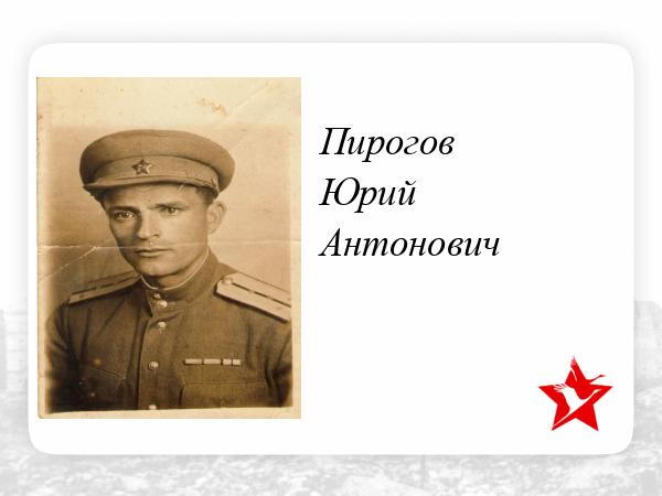 "Мой прадедушка Пирогов Юрий Антонович (18.08.1910 – 17.03.1969) родился в с. Печенеги Харьковской области в семье служащего. Рано остался без матери, которую заменила заботливая, любящая мачеха. Отец работал бухгалтером, а перед началом Великой Отечественной войны был арестован органами НКВД по доносу соседа, которому рассказал анекдот о Сталине. После окончания школы Юрий Антонович поступил в Чугуевский техникум сельского хозяйства, а в 1934 году поступил в Харьковский ветеринарный институт, который окончил в 1938 году. Закончив институт, работал в течении двух лет в сельскохозяйственном техникуме г.Чугуева. В 1940 – 1941 г.г. работал главным врачом ветеринарной службы Калмыцкой АССР. На военную службу был призван в 1941г. младшим ветеринарным врачом 1058 артиллерийского полка 81 стрелковой дивизии Донского фронта. В 1943 -1945 г.г. нес службу на должности старшего ветеринарного врача 1382 стрелкового полка 87 стрелковой дивизии 4–го Украинского и 2-го Прибалтийского фронта. День Победы встретил в Прибалтике в звании капитана. Ранений, контузий не имел, в плену не был. После окончания войны был направлен на службу на Урал в г. Пермь. В сентябре 1946 г. Был демобилизован из армии. С 1946г. Работал главным ветеринарным врачом в г. Ирклиеве Полтавской области, с 1952 г. – г. Чугуева Харьковской области, с 1954г. – главным врачом Орлицкой ветеринарной лечебницы Полтавской области. Награжден медалью «За отвагу» ( 1943г.), медалью «За боевые заслуги», медалью «За оборону Сталинграда»(1942г.), медалью «За победу над Германией»(1945г.), имеет юбилейные медали. Семейное положение – женат, жена – Пирогова Мария Трофимовна, дочери – Неонила (1940 г.р.), Светлана (1942 г.р.), Жанна (1948 г.р.), Тамара (1949 г.р.)."