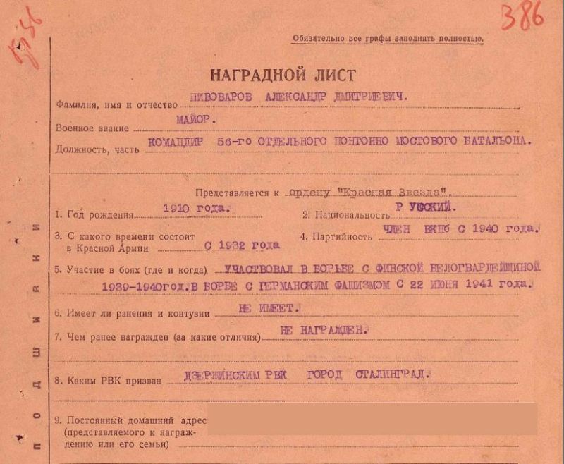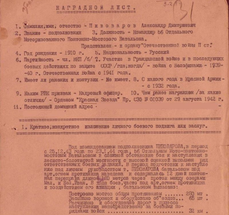 О боевом пути батальона под командованием А. Д. Пивоварова, о характере выполняемых им задач и о том, как Александр Дмитриевич командовал вверенной ему частью, можно судить по сохранившемся в архивах наградным листам.