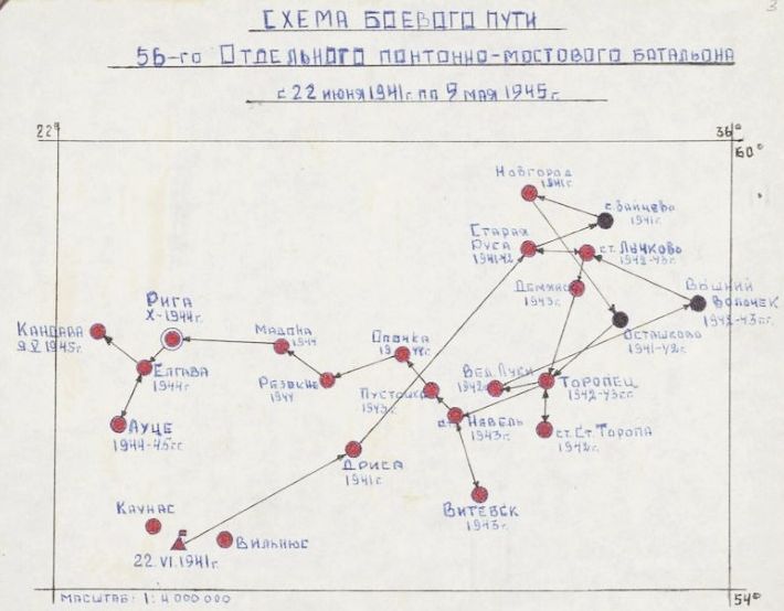 56 отдельный моторизованный понтонно-мостовой батальон был сформирован в результате преобразования 30-го Понтонного полка. В течение Великой Отечественной войны батальон принимал участие в боевых операция 11-й армии, Новгородской армейской группы войск, 4-й ударной армии, 34-й армии, 27-й армии, 1- ударной армии, 57-й армии, 20-й армии, 11 гвардейской армии и 10-й гвардейской армии.