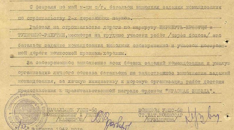 Работая на строительстве дороги по маршруту Шеребуть – Крестцы и Тупичино – Рябутки, несмотря на трудные участки работ (через болота), его батальон задания командования выполнил своевременно и участок построенной дороги комиссией признан хорошим».