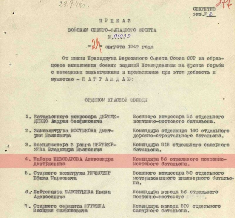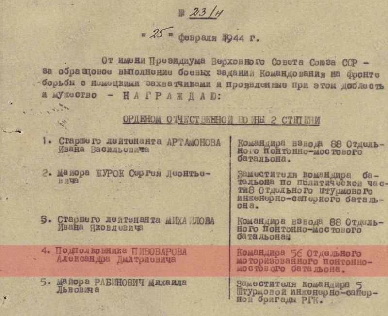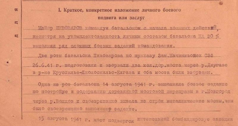 Так, при представлении А. Д. Пивоварова к ордену Красной Звезды в наградном листе от 10 августа 1942 г. говорится: «Майор Пивоваров, командуя батальоном с начала боевых действий, несмотря на укомплектованность личным составом батальона на 30%, выполнял ряд сложных боевых заданий командования. Две роты батальона Пивоварова по приказу Заместителя начальника инженерных войск Северо-Западного Фронта 26.06.41 подготовили и взорвали два железнодорожных моста через р. Даугава в районе Круспилье – Яколоснильс – Елгава.