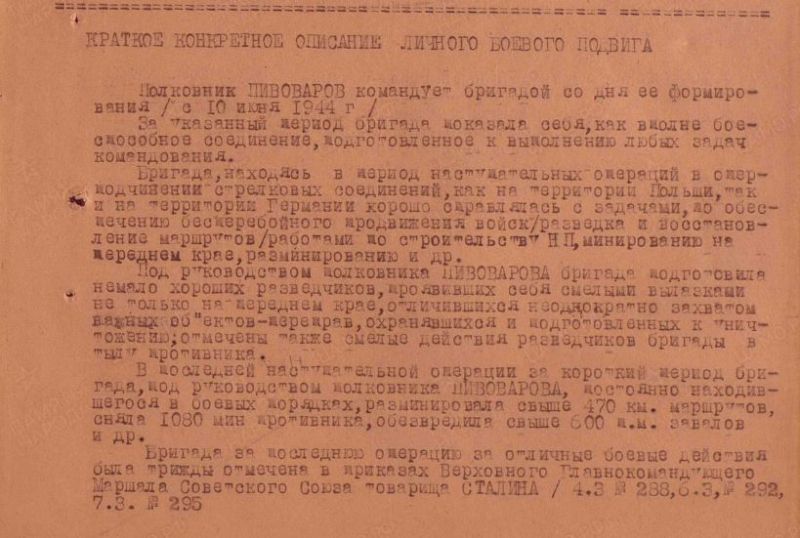 При представлении полковника А. Д. Пивоварова к ордену Красного Знамени в наградном листе от 28 июня 1945 г. говорится: «Полковник Пивоваров командует бригадой со дня ее формирования (10 июня 1944 г.). За указанный период бригада показала себя как вполне боеспособное соединение, подготовленное к выполнению любых задач командования.