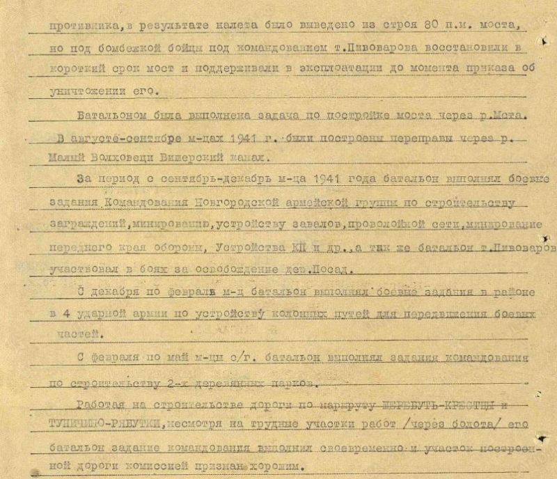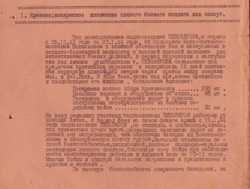 На всех решающих участках подполковник Пивоваров работами руководил лично. В период боев на левом фланге армии с 19.01.44 года подполковник Пивоваров, не считаясь с опасностью, лично, под пулеметным огнем врага, разведывал состояние дорог на заданных ему направлениях, чем обеспечил быстрое их восстановление и своевременную подачу грузов. Батальон отличается высокой боеспособностью, дисциплиной, должным политико-моральным состоянием личного состава, благодаря чему бойцы при необходимости самоотверженно работают в ледяной воде по 10 –12 часов. Многие бойцы и офицеры батальона награждены и представлены к орденам и медалям».